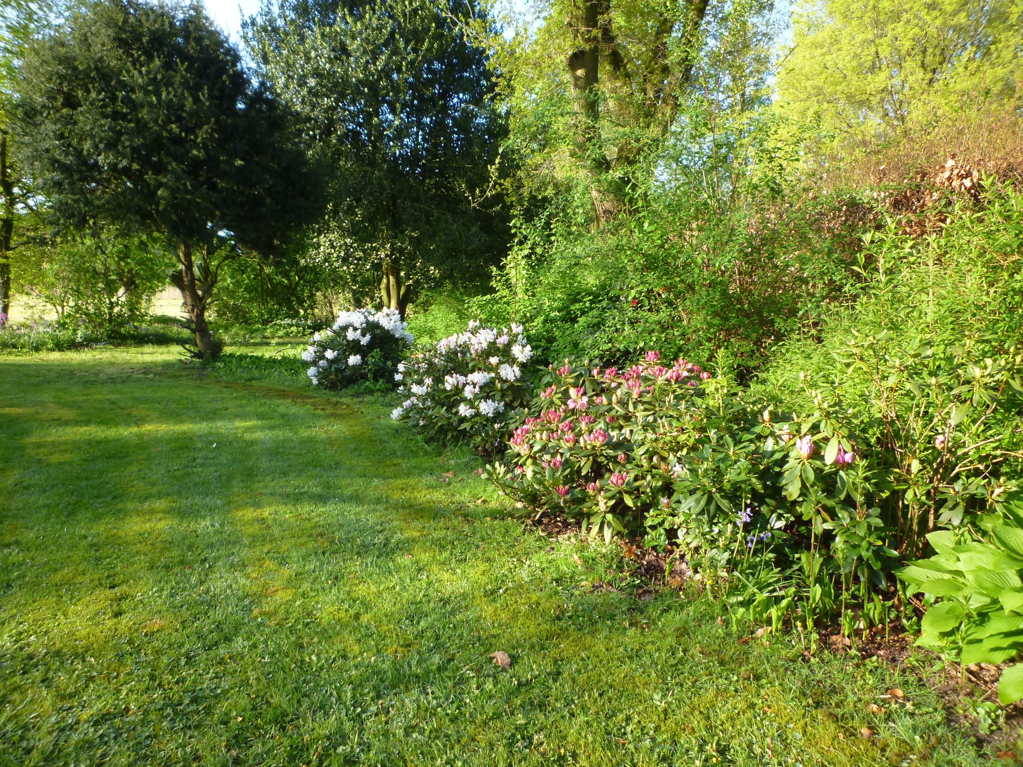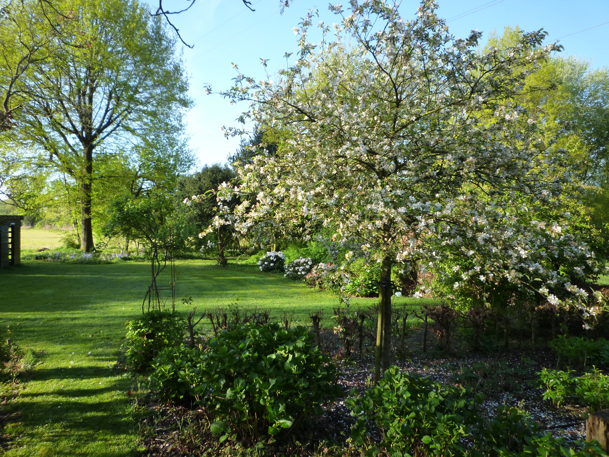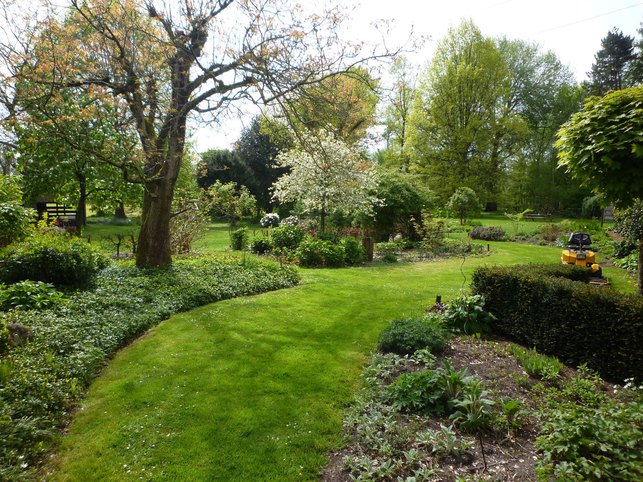 Toen wij hier 50 jaar geleden kwamen wonen lag achter de boerderij een stuk grasland van 8.600 m2, kaal en vlak. We keken zo uit op de flats in Helmond Noord. Wij zijn toen, naast verbouwingen, ook meteen begonnen met beplanten. Een singel met 2000 struikjes, boompjes. Hetgeen uiteindelijk is geworden wat het nu is. Een combinatie van bloemperken, struiken en grote bomen en toch ook nog veel gras met in het midden een prachtige Moeraseik. In de tuin staat ook nog een yurt. Het is geen postzegeltuintje en daardoor nogal bewerkelijk, dus hier en daar kan best nog wel een onkruidje groeien.